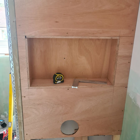 Lastly there were two holes under the window which were boxed off, trim applied and shelving for storage made from the tiles.